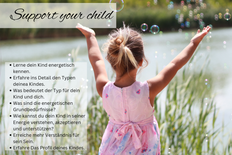 Du bekommst von mir einen Einblick in den Typen und das Profil von deinem Kind. Hier erfährst du schon etwas warum dein Kind ist wie es ist und was es so besonders macht. Du erfährst einige Merkmale von mir und lernst es besser zu verstehen und somit kannst du ihm zur Seite stehen es zu bestärken in seinem Sein. Ich helfe dir und gebe dir Gelegenheiten tiefer in dein Kind zu sehen und gebe dir die Möglichkeit darauf zu reagieren und Anregungen, wie du dein Kind in seinem Human Design Typen und Profil unterstützen kannst und ihr ein angenehmeres miteinander findet. Was braucht dein Kind? Ich gebe dir die Antwort. Du kannst es in seiner Ganz individuellen Energie begleiten und wahrnehmen und somit besser sehen und fühlen und damit ein besseres Verständnis auch für sich selbst geben.