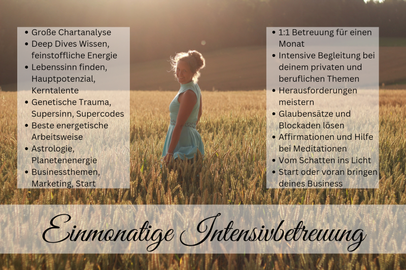 Jede Frage darfst du stellen, ich bin ein Monat intensiv dein Begleiter und öffne dir deine Türen und helfe dir dabei Mut zu fassen, gesunde Risiken einzugehen und raus aus deinen Ängsten. Ich gebe dir zu jedem deiner Themen Meditationshilfen. Geh in deine Transformation und erlaube es dir wert zu sein zu wachsen und zu reifen und auch Geld zu generieren. Wir reden über dein money mindset, du darfst eine gesunde Bindung zu Geld aufnehmen und auch zu deinen anderen Themen, die dich beschäftigen.