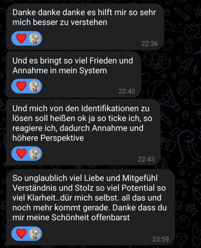 Dazu wirst du von mir persönliche Unterstützung bekommen zu deinen Struggle, egal ob du privat emotionale Heilung oder Herausforderungen hast, Entscheidungsprobleme und wie du nun deinen analysierten Chart noch besser verstehen kannst. Wir werden genaue Bereiche deines Lebens ansehen, die dir diese Probleme bereiten. Wir werden deinen analysierten Chart genau auf deine persönliche Lebenslage übertragen und mit ihm gezielt arbeiten. Wir gehen von deinen Schatten Themen Schritt für Schritt in deine Lichtthemen. Ich unterstütze dich mit passenden Affirmationen, wir lösen gemeinsam deine Blockaden und Glaubenssätze.