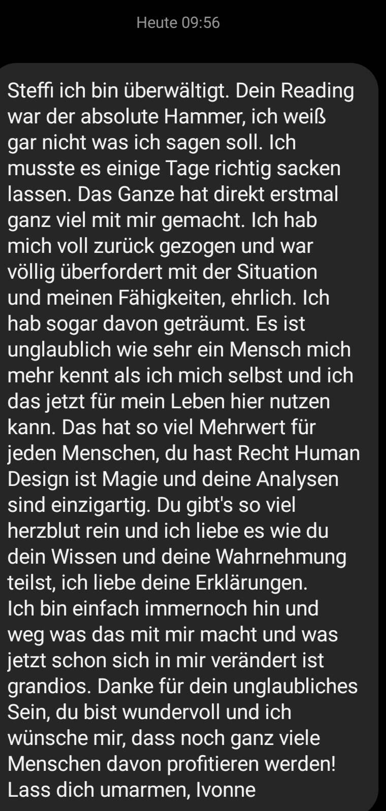Ich helfe dir dabei, denn dafür bin ich hier! Fühle in dich hinein ob es Zeit ist den nächsten Schritt zu gehen und deine Blockaden und Glaubenssätze zu dir selbst zu lösen. Das Leben wartet nicht auf den perfekten Moment, es wird dir immer wieder Chancen geben die du nutzen kannst oder verstreichen lässt. Du entscheidest, fühle rein. Ich möchte nochmal betonen, was ganz spannend ist. Human Design ist nicht deine Wahrnehmung, es geht immer darum wie deine Energie besser fließen kann, was zu dir passt und wie du dich transformieren kannst. Wenn du stehen bleiben willst ist Human Design nichts für dich. Ansonsten kannst du hier sehr viel lernen und wirst mehr und mehr mit deinem Code of life zu deinem Higher Self kommen.
